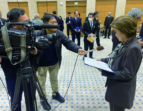 合同締結式後、さぬき市ケーブルテレビの取材を受ける山口社長