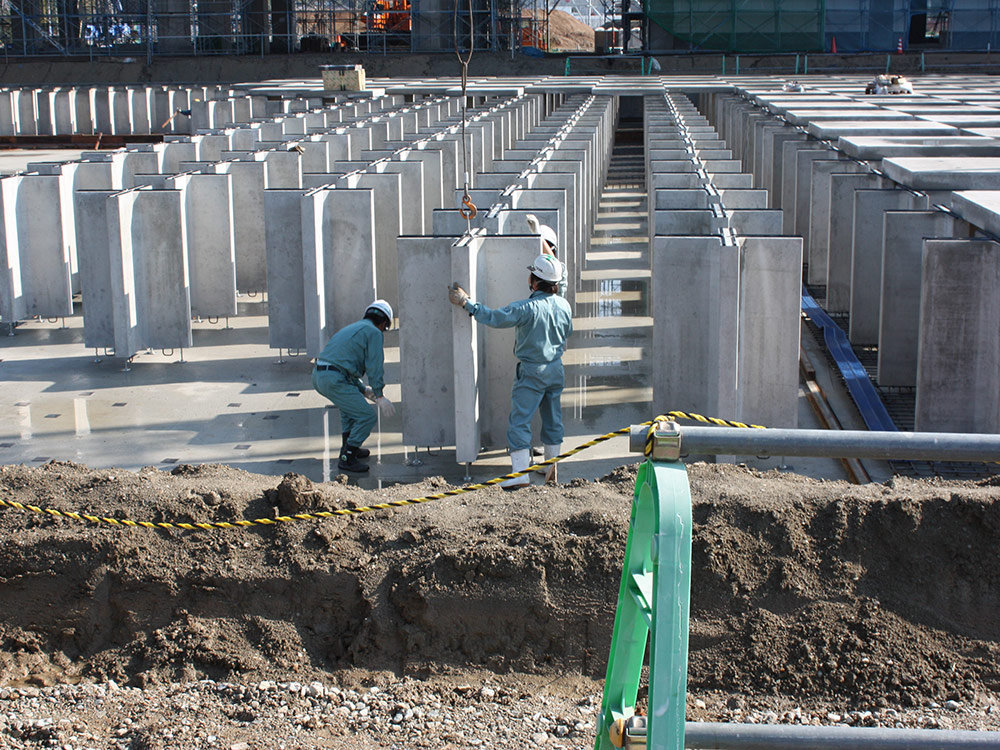 構成部材の軽量化により、据付が容易で工期短縮が図れ経済性に優れた、ハーフプレキャスト構造の雨水地下貯留槽です。